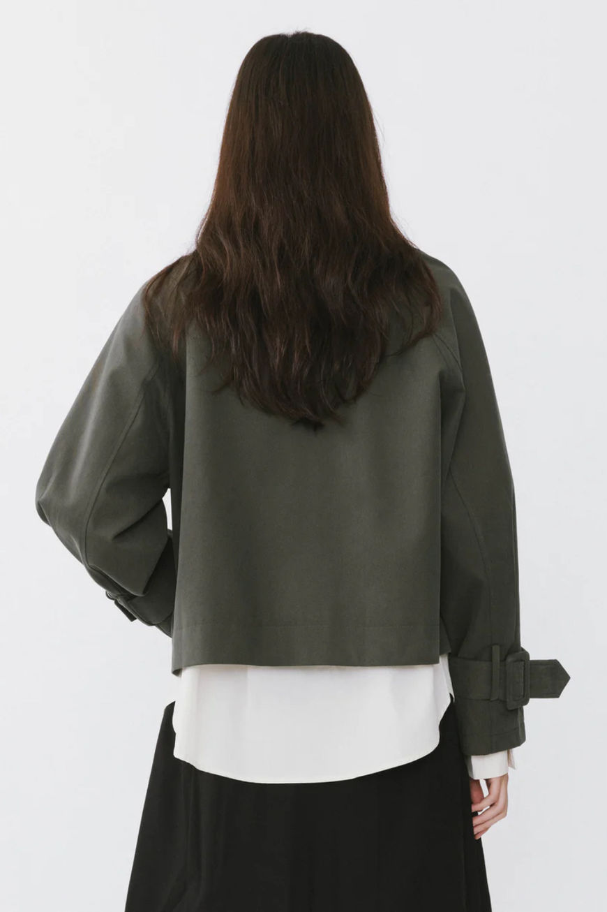 A bold twist on a classic silhouette, this Overlay Cropped Trench Coat blends utilitarian elements with modern structure. Designed with a unique front overlay and a cropped hemline, it’s the perfect transitional layering piece. The stand-up collar and belted details at the neck and sleeves add a refined, architectural touch, while the raglan and two-piece sleeves ensure both comfort and movement.