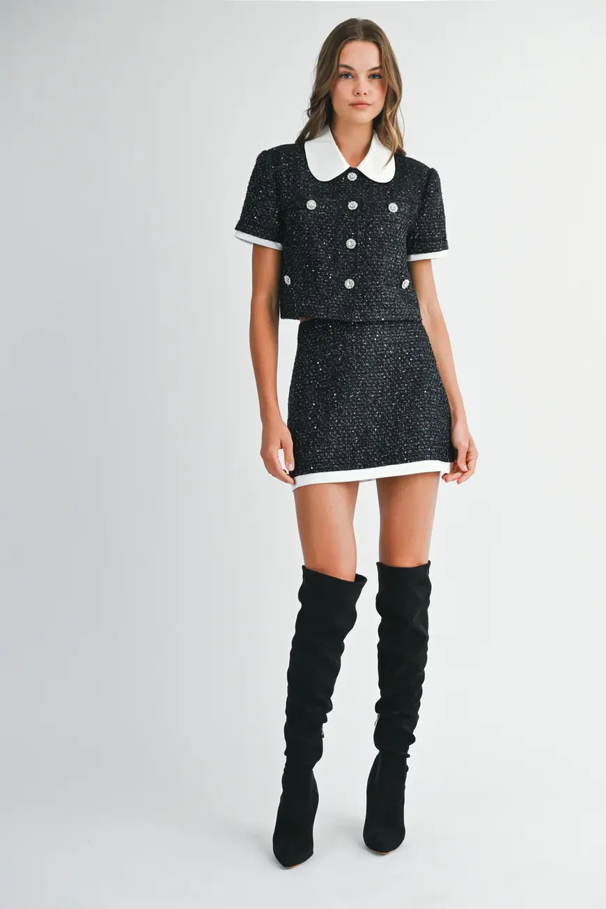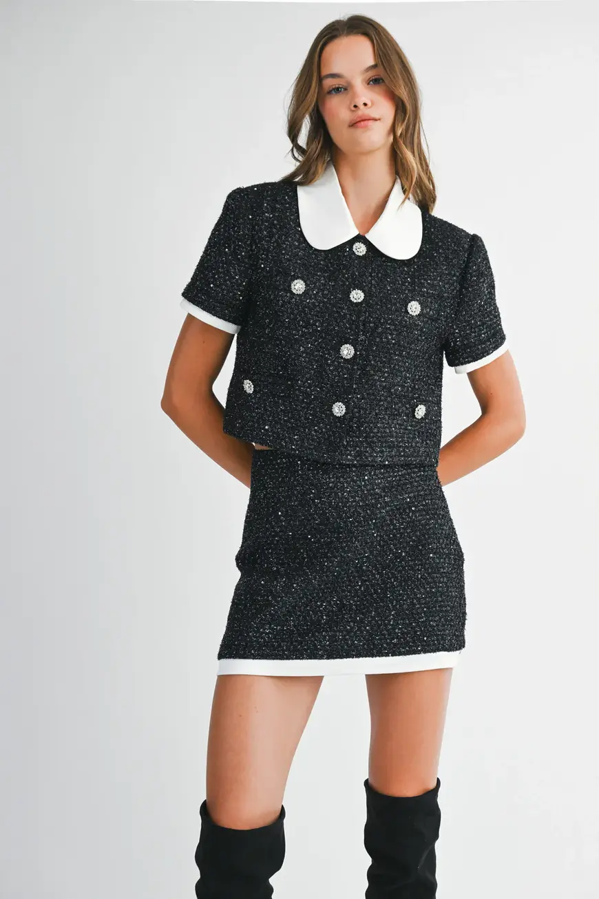 Make a dazzling statement with the Gaby sequin tweed set — a modern twist on classic Parisian elegance. This two-piece set features a cropped short-sleeve jacket adorned with a contrast Peter Pan collar and sparkling rhinestone buttons, paired with a matching mini skirt for a coordinated, fashion-forward look. Fully lined for comfort, it’s the perfect outfit for cocktail parties, fashion events, or simply when you want to turn heads.