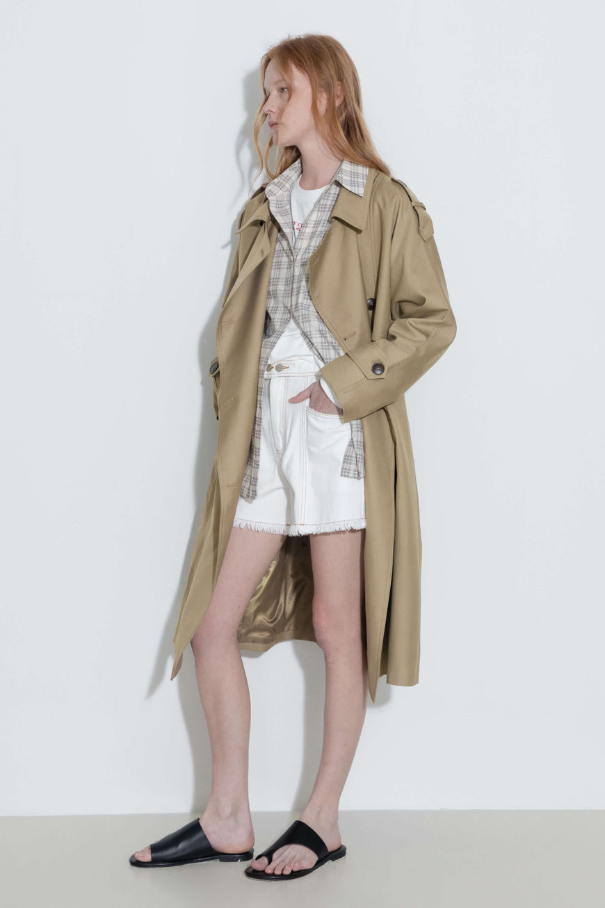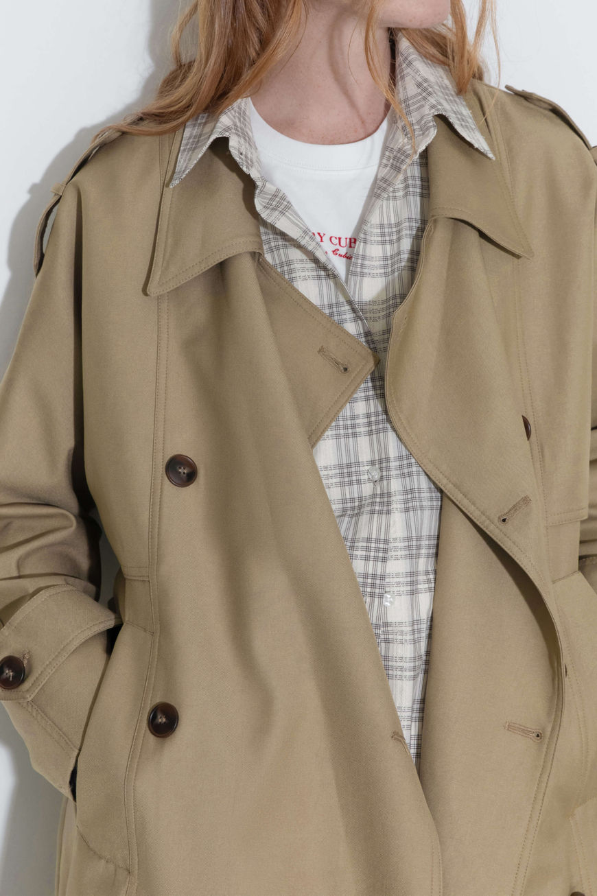 This double-breasted trench coat in khaki brings together structure and softness with its flowing A-line cut and crisp tailoring. Designed with dropped shoulders, a waist belt, wide lapels, and button-down front, it’s the perfect outer layer to elevate your everyday uniform. Belted cuffs and shoulder straps add a refined finish, while the lightweight fabric makes it ideal for transitional dressing.