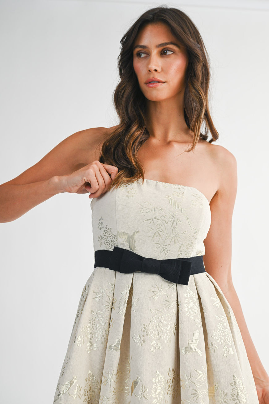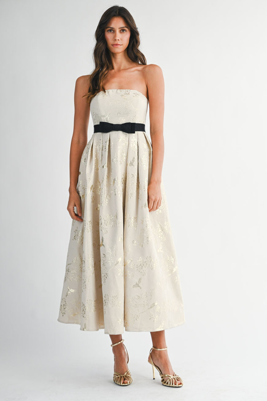 Elevate your evening look with the Jacquard Strapless Midi Dress with Contrast Bow. Designed in a luxe jacquard fabric, this strapless silhouette features a pleated A-line skirt that moves gracefully with every step. The contrast bow detail at the waist defines the figure, while the back self-tie and invisible zipper ensure a secure, comfortable fit.