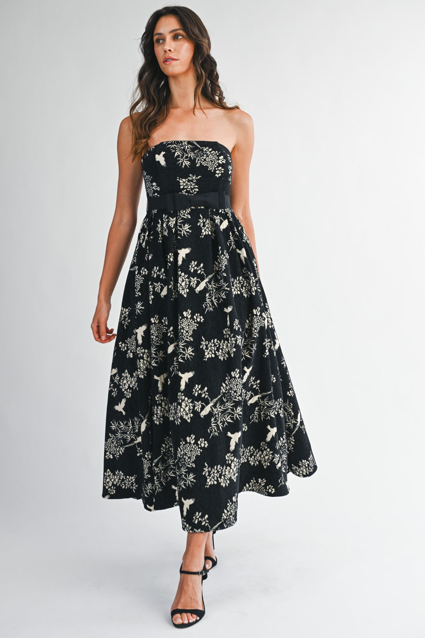 Elevate your evening look with the Jacquard Strapless Midi Dress with Contrast Bow. Designed in a luxe jacquard fabric, this strapless silhouette features a pleated A-line skirt that moves gracefully with every step. The contrast bow detail at the waist defines the figure, while the back self-tie and invisible zipper ensure a secure, comfortable fit.