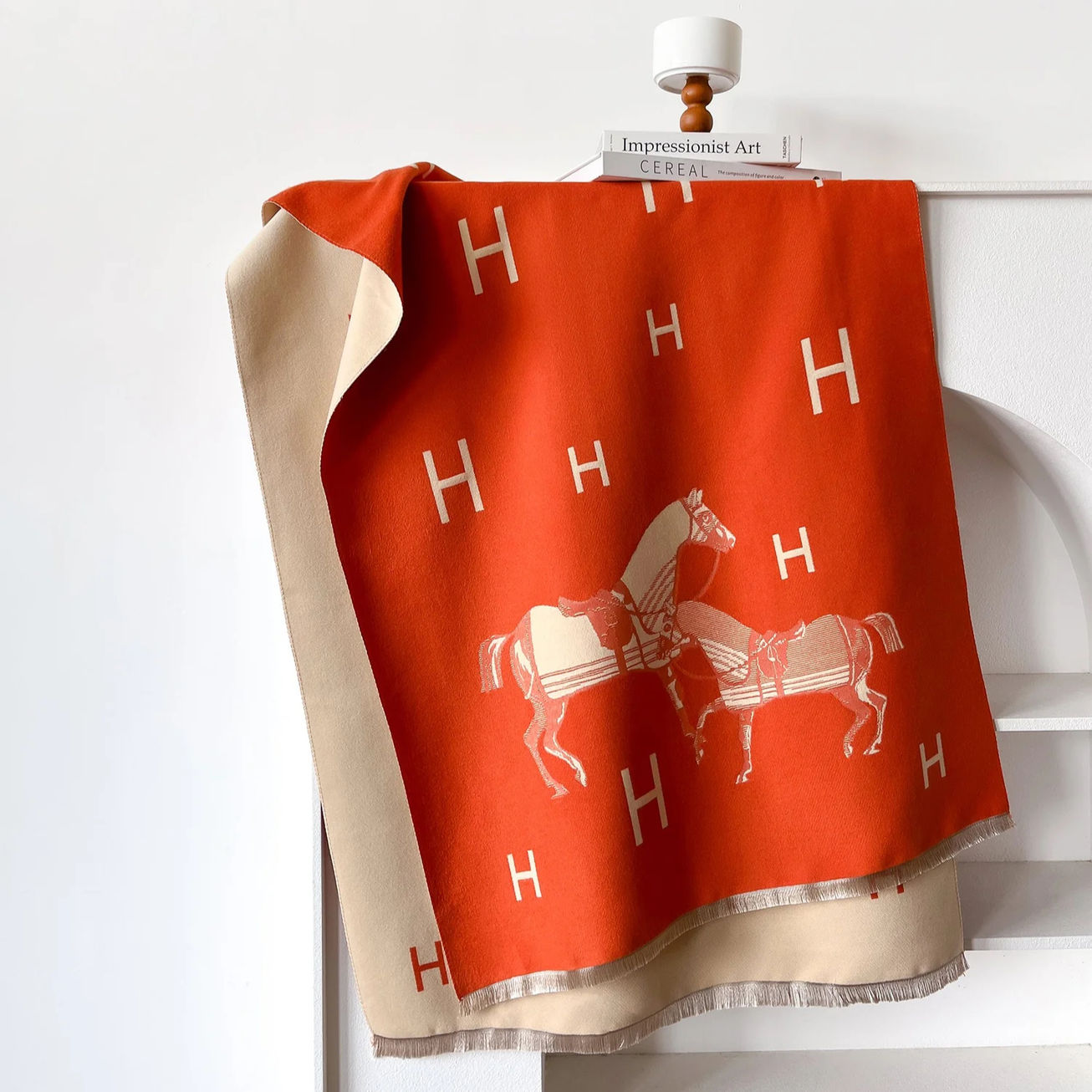 Crafted with care from a luxurious cashmere-feel blend, the wrap drapes beautifully over the shoulders, offering both warmth and refinement. The elegant horse motif and finely stitched edges highlight exquisite craftsmanship, making it as stylish as it is comfortable.