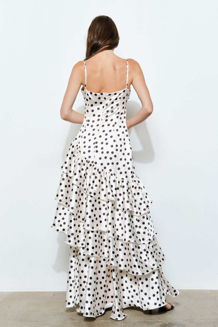 Satin Polka Dot Tiered Ruffle Maxi Dress