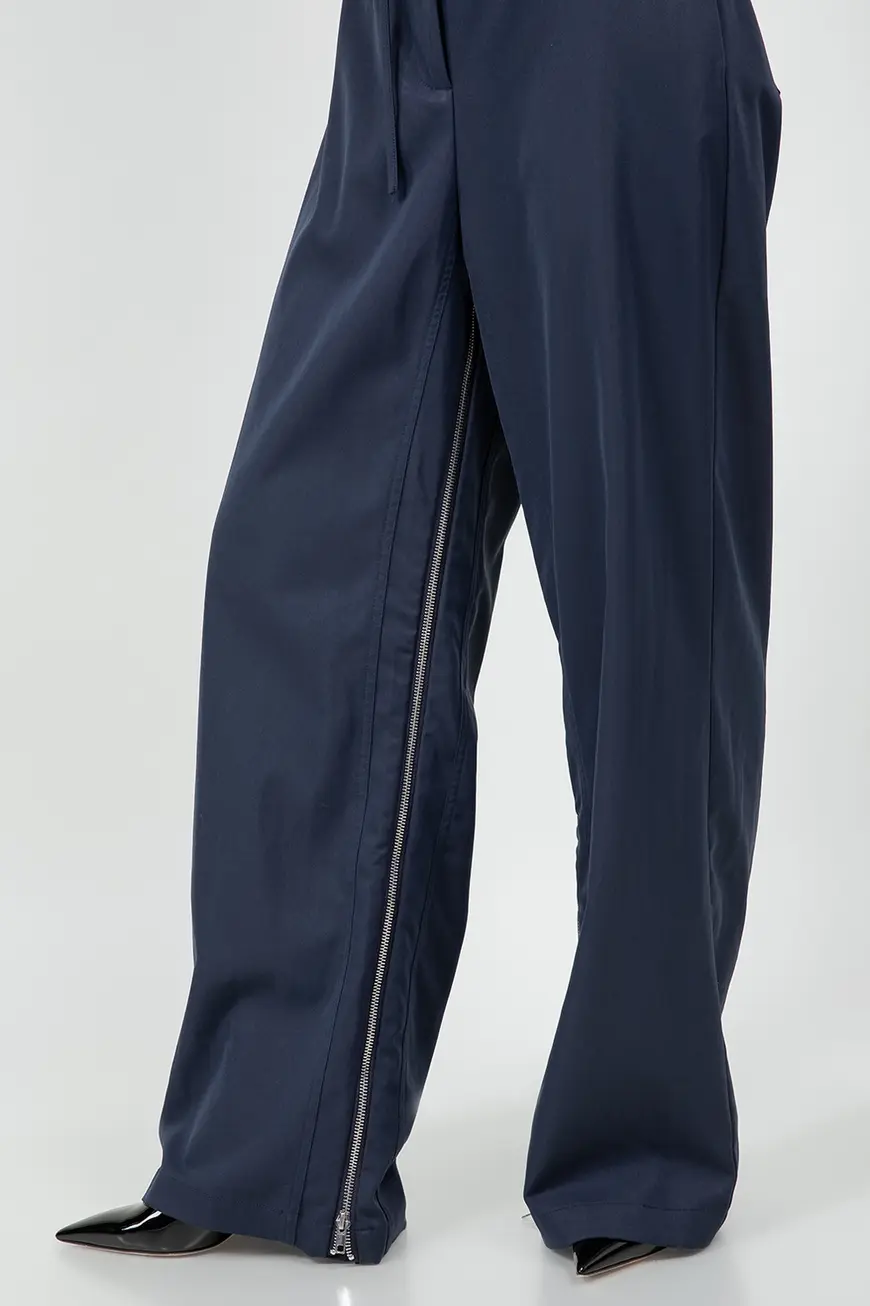 Designed with a modern utilitarian edge, these wide-leg trousers are a versatile statement piece. Crafted from a structured stretch fabric, they feature bold inseam zippers running from hem to thigh, allowing adjustable openings for both style and comfort. The drawstring waist adds a relaxed, customizable fit, while the full-length silhouette elongates the leg. Perfect for styling with heels or sneakers for an effortlessly cool look.