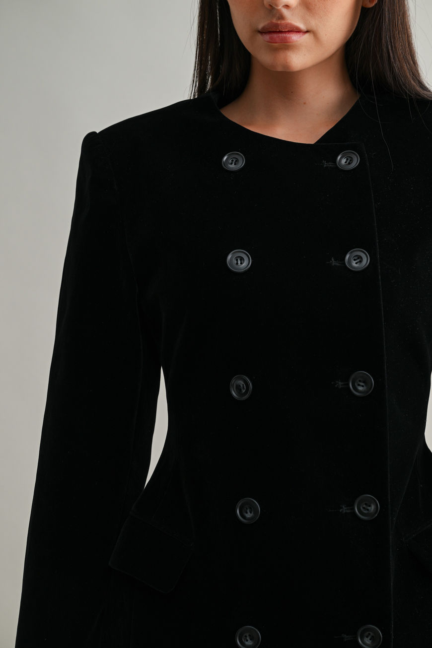Made from luxurious velvet with a smooth satin lining, this tailored piece enhances your shape with a fitted waist and structured shoulders that create a bold yet feminine look.