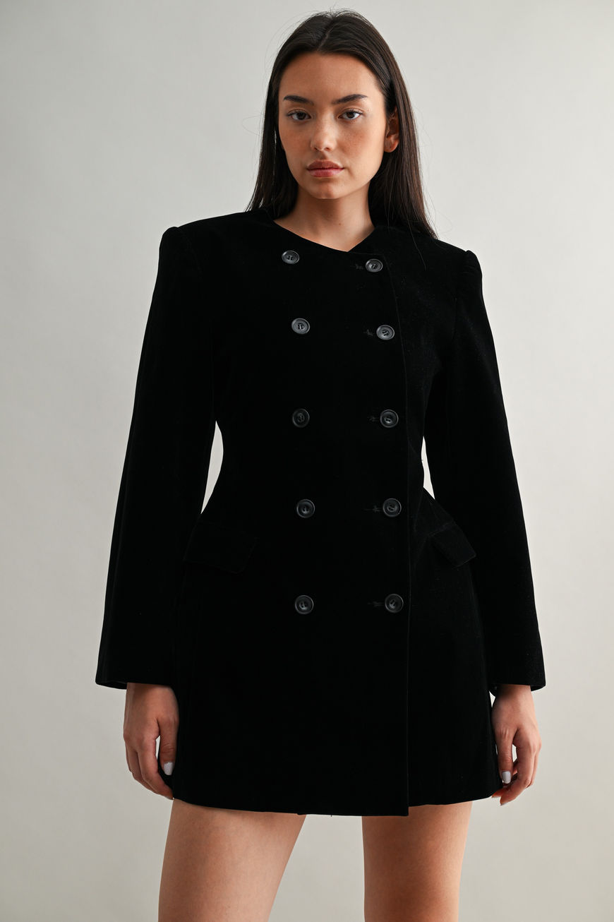 Double-breasted buttons add a classic touch, while the mini length keeps it modern and versatile — perfect for evenings, events, or elevated daywear.