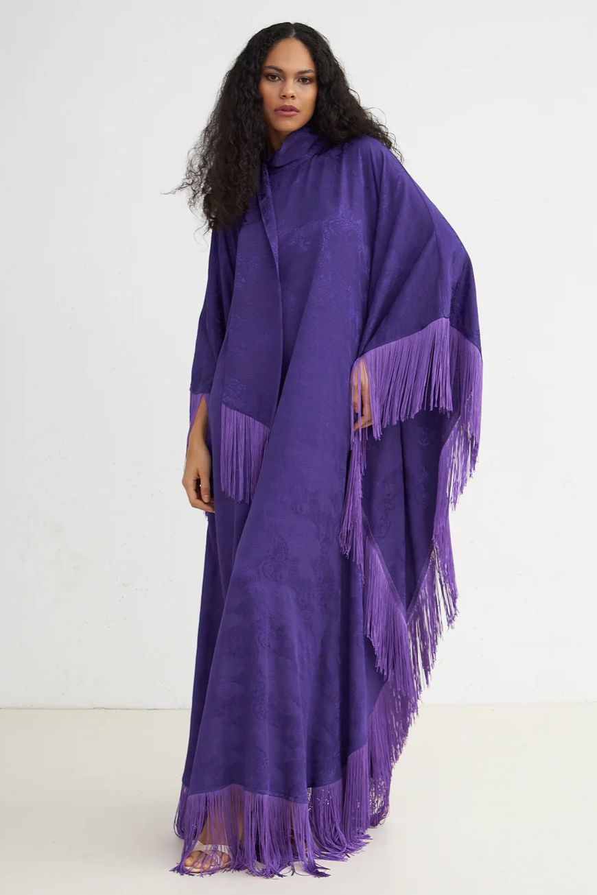 Crafted from 100% viscose jacquard, this flowing kaftan features a refined tie-neck detail and delicate tonal fringes that enhance its fluid silhouette. The rich purple hue radiates confidence and grace, while the soft texture drapes beautifully on the body. Perfect for evening occasions, cultural events, or luxury resort wear, this kaftan redefines effortless glamour.